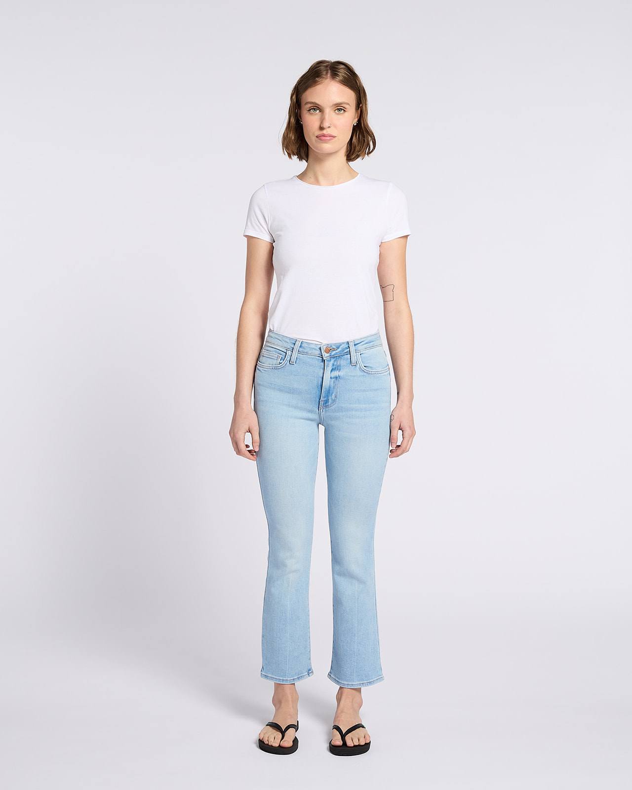 The Bambino Cropped Skinny Flare is a cropped style that hugs the leg before subtly flaring at the hem. With whiskering and a crease line down the front, this style creates an elevated, slimming effect that pairs effortlessly with any shoe.
